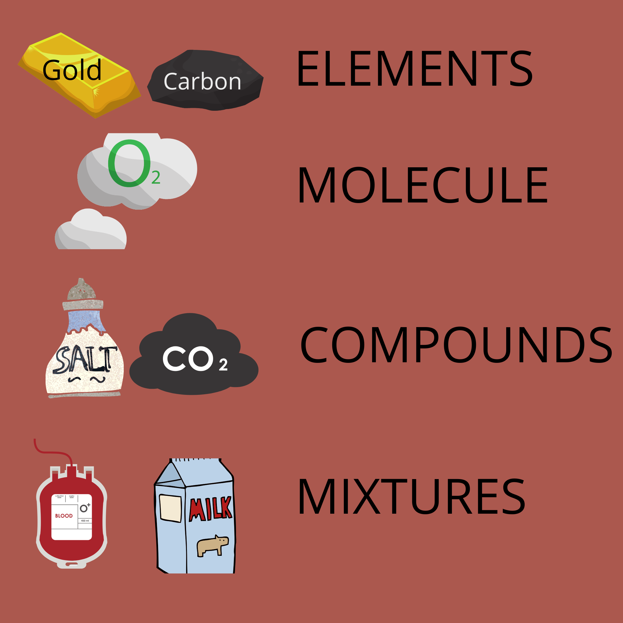 Elements are made up of only one kind of atoms with unique properties which are different from those of other atoms. Hence, it is considered the simplest form of matter and a pure substance. For example, oxygen, hydrogen, and carbon are all elements with a unique name. Atoms that oxygen is made up of are different from those of hydrogen or carbon. In nature, elements occur as either a population of individual atoms such as gold, carbon or as molecules of two or more atoms joined together.